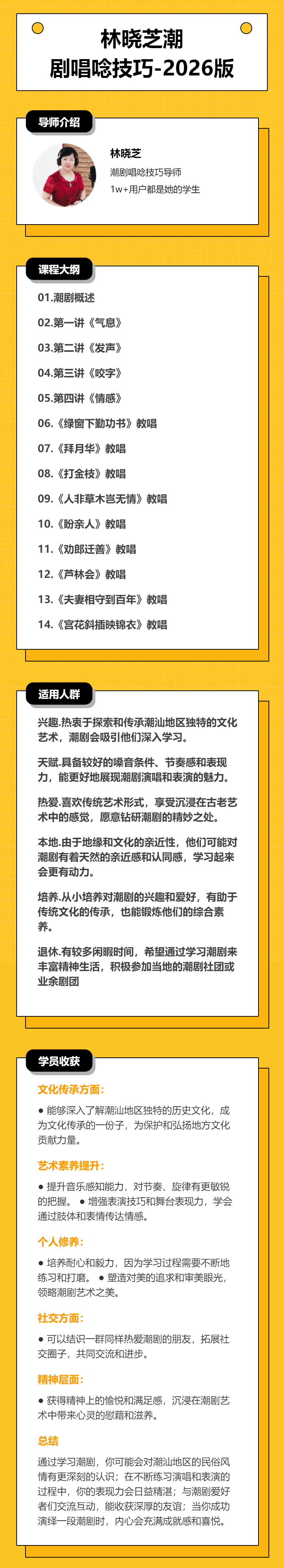 89年毕业于汕头戏曲学校,专功青衣行旦,擅长唱唸艺术。89年参加全省戏曲学校唱唸比赛,荣获二等奖。06年被聘请为揭阳广播节目中心潮剧指导老师,同时开班教学。21年被揭阳市老年大学聘为唱唸老师。